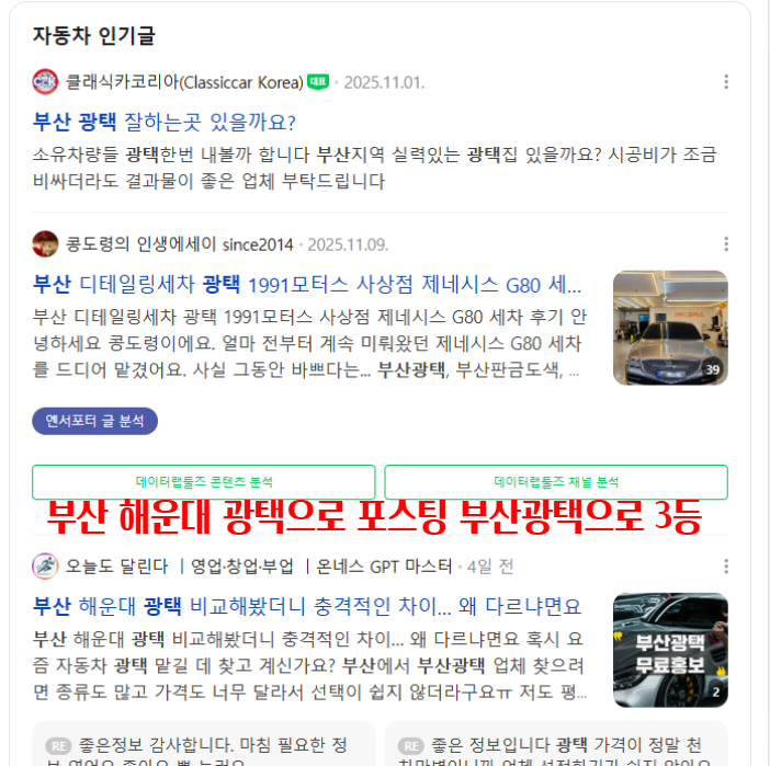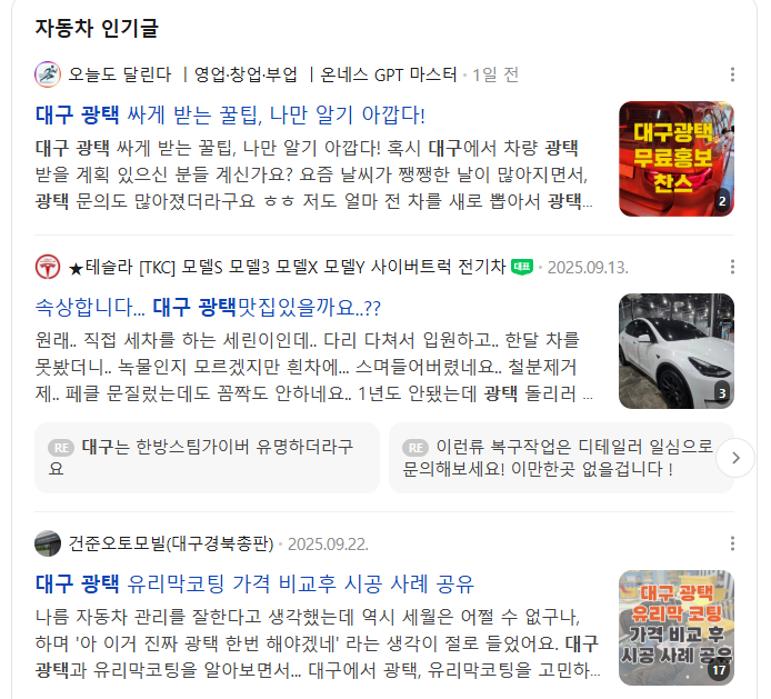 개인 블로그보다 진입 장벽이 낮고, 사업 아이템이 있는 분들은 광고처럼 보이지 않게 본인 사업을 자연스럽게 노출할 수 있다는 장점이 있습니다. 이 구조는 카페마케팅 기반 사업 홍보 흐름을 참고하면 이해가 쉽습니다. 부산 광택으로 네이버 상단 노출은 전문가들만 할 수 있는데 초보도 바로 가능하게 하는 것 그것도 즉시 가능하게 되니까요 초보도 가능한 것은 최적화 카페와 최적화 아이디만 있으면 가능하기 때문입니다. 대구 광택도 가능합니다. 지역 자영업자들에겐 좋은 기회입니다